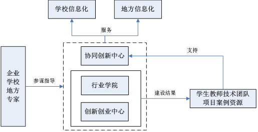 在三位一体中,创新创业中心是基础,行业公司是关键,协同创新中心是结果。创新创业与行业公司的建设结果之一是员工教师技术团队的构成,大量项目案例资源的积累。建设结果为协同创新中心更好地为公司信息化与地方企业信息化服务,提供了有力的支持。见图2。