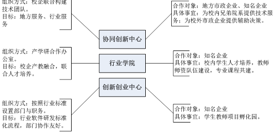 创新创业中心、行业公司和协同创新中心等3个建设工作密不可分。其中创新创业主要目的是构建员工教师创新创业团队,经过团队磨合与技术培养,形成市场化的案例与项目资源库;主要事宜是员工教师项目孵化园。行业公司主要目标是校企产教融合,联合人才培养,主要事宜是校内员工人才培养,教师团队队伍建设与专业课程共建等。协同创新中心主要目的是依托团队,为地方行业提供服务;主要事宜是对内为兄弟院系提供技术服务,对外为市政企业提供辅助决策服务。见图1。