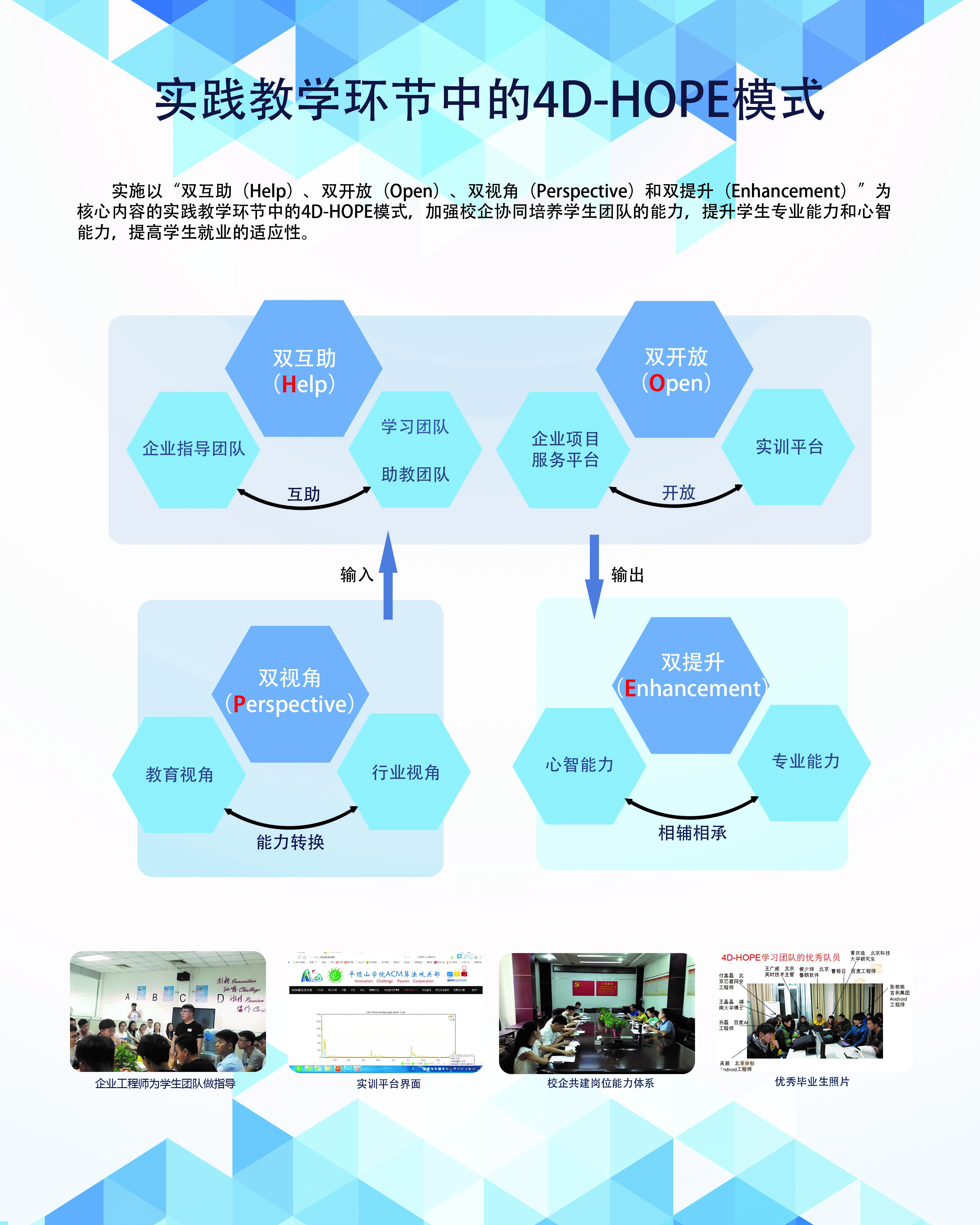 围绕“4D-HOPE教学模式改革”,公司完成了校级教学改革研究项目1项,完善了以能力为导向的优化了课程教学资源1套,建立了稳定有序的“4-3-2-1”课外助教团队1个,出版教材2部。