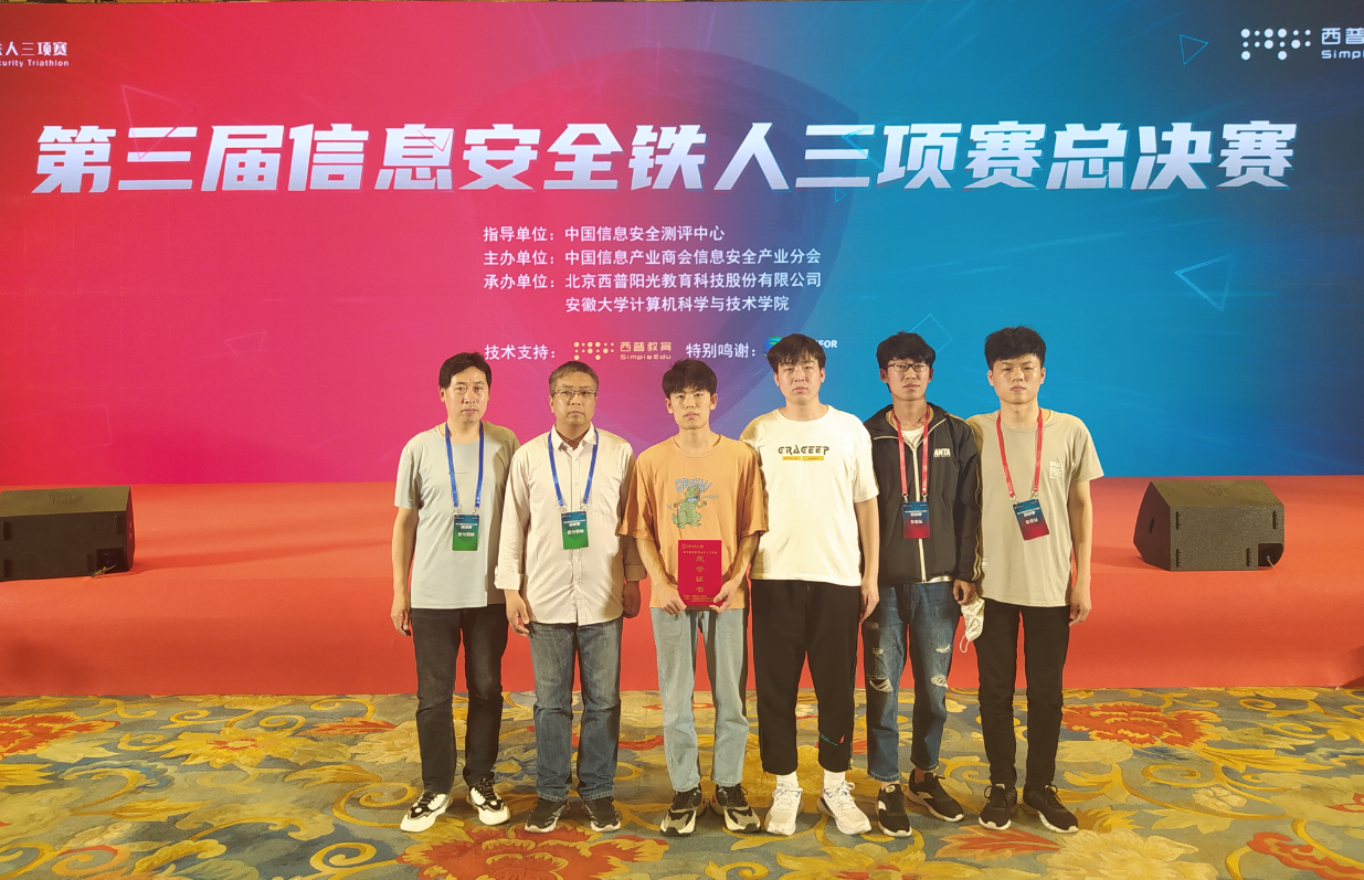 5月8日第三届全国信息安全铁人三项赛总决赛在安徽大学落下帷幕,​365英国上市公司陈惠兵、单智涵、赵志豪、王蒙蒙、高聚阳、马凯驰六人组成的战队经过一天奋战,荣获三等奖,实现了​365英国上市公司在本项赛事国家奖零的突破。
