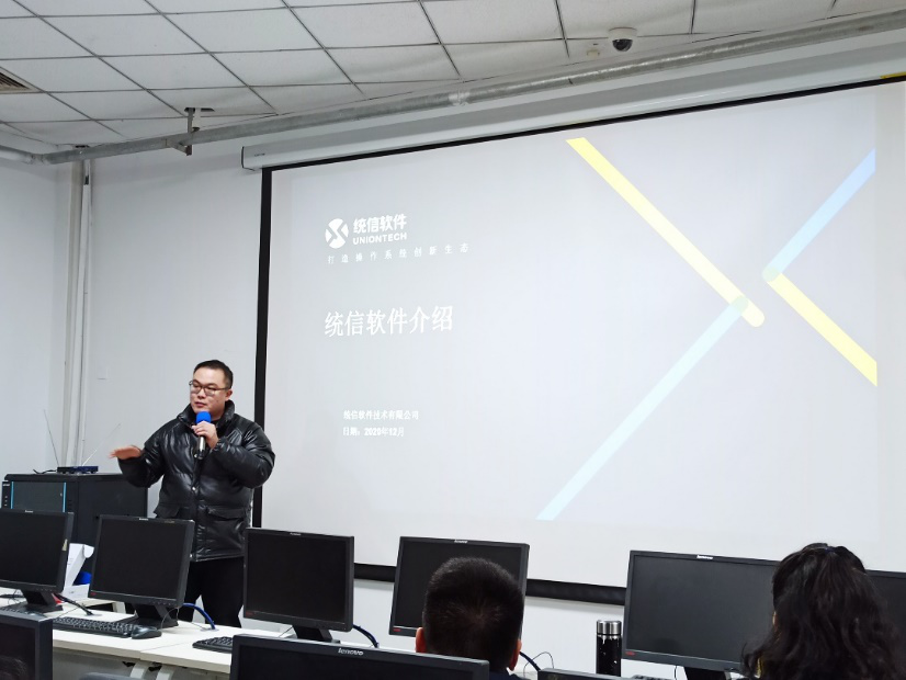 吕经理首先对鲲鹏产业公司校企合作共建工作室筹建情况做了介绍,接着分别邀请三家企业代表进行技术分享。统信软件技术有限公司代表周亚辉经理对关于我们和公司规划作了简单介绍,然后通过分析国内操作系统现状来突出讲解统信软件的优势,最后又讲解了企业课程体系和岗位技能需求,号召同学们积极加入。