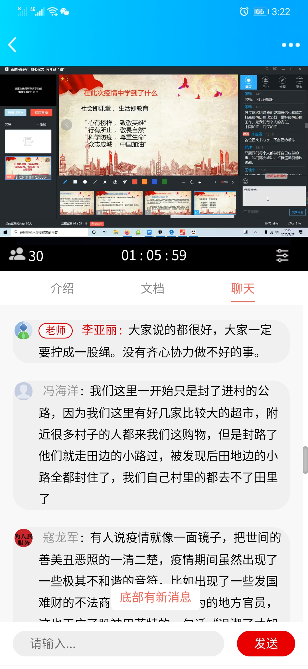 2020年2月27日,公司组织开展以“凝心聚力,青年战‘役’”为主题的线上团课。此次团课由公司团总支副书记李亚丽老师担任主讲。17、18和19级的团支书参加了此次团课。