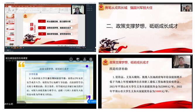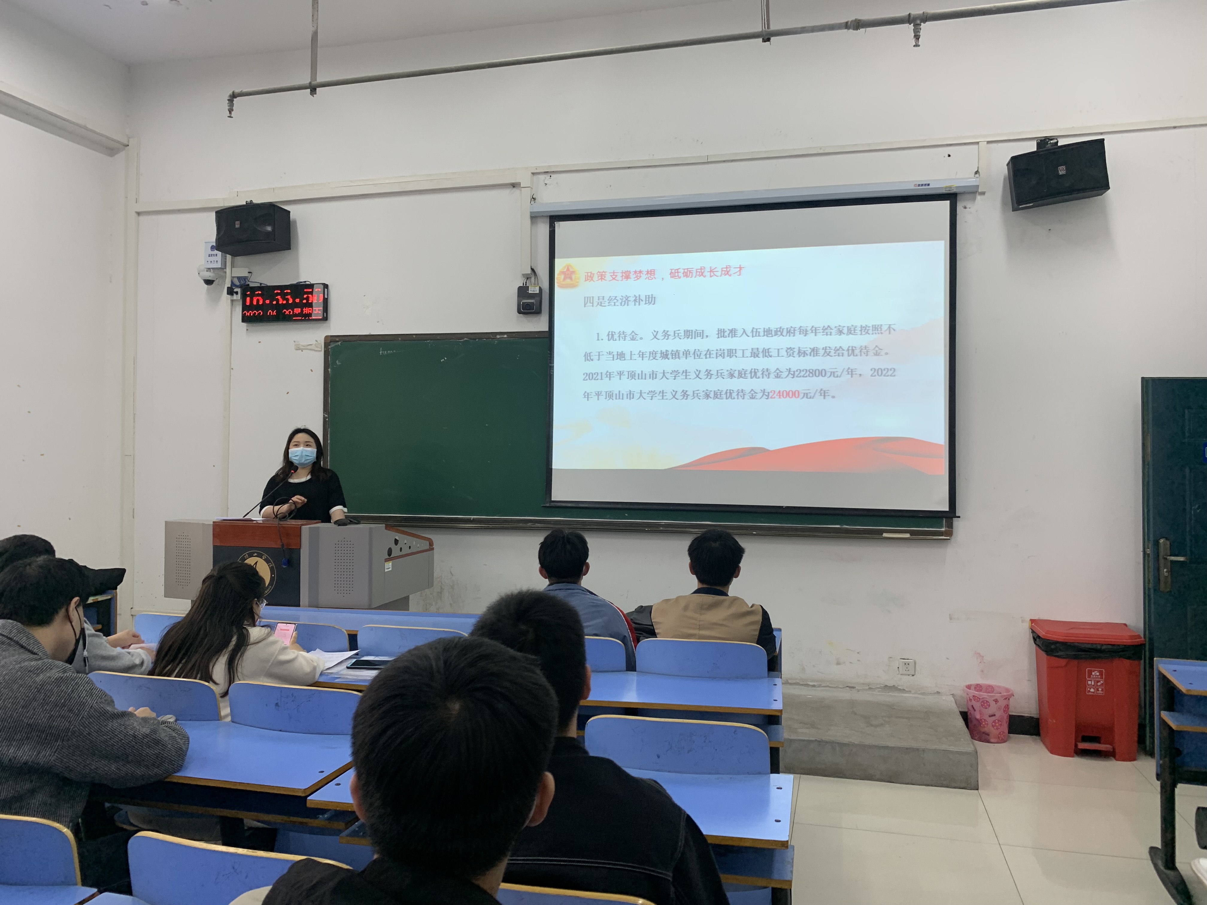此次宣讲会以“携笔从戎筑长城,强国兴军担大任”为题,各年级辅导员集中备课,宣讲从征兵流程、经济补助、政策优待、个人成长进步空间等多方面进行深入解读,详细向同学们介绍入伍、复学、提升学历、就业、公务员招考、部队培养使用等方面的优抚政策,特别为毕业生讲解了直招军士的相关政策。宣讲中,辅导员老师们结合当下征兵形势和公司参军入伍员工的真实经历,讲述了参军入伍带给同学们的发展际遇,引导同学们认识到投身火热军营,献身国防事业的重要性。