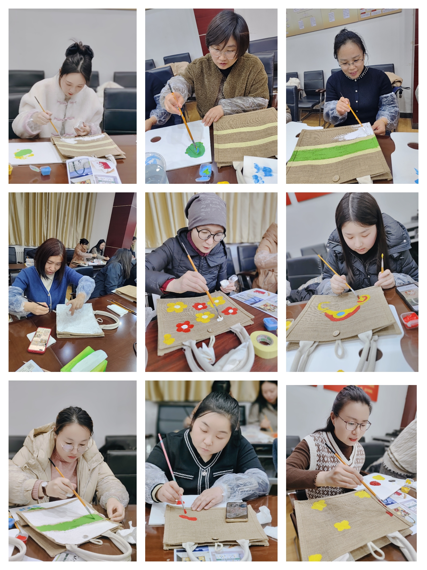 活动伊始,由指导老师详尽地给大家介绍本次活动所需材料、制作方法、绘画技巧等,大家全神贯注的用画笔一笔一画勾勒出自己喜欢的图案,与同伴、指导老师商讨搭配的颜色。活动现场大家积极展示自己的创意和手工技能,将普通的手提袋变成了个性十足、充满艺术魅力的作品。