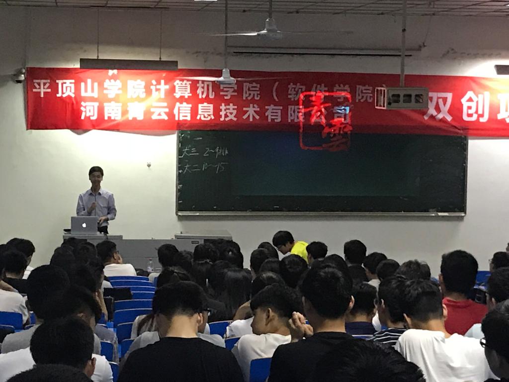 为提升员工的创新创业意识,激发员工的创造力,提高员工就业创业能力,公司于5月17日晚在4406教室举办了双创项目动员大会。吕海莲经理、河南青云信息技术有限公司(以下简称“青云”)CEO兼创始人张双飞、青云首席技术官周奥琪、青云IT公司经理李阳、青云校企合作部经理周阿英和郭霜颖、辅导员梁华国老师出席大会,团总支副书记车江波老师主持,各年级师生共200余人参加了此次动员大会。