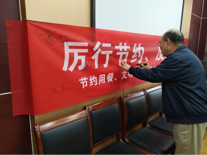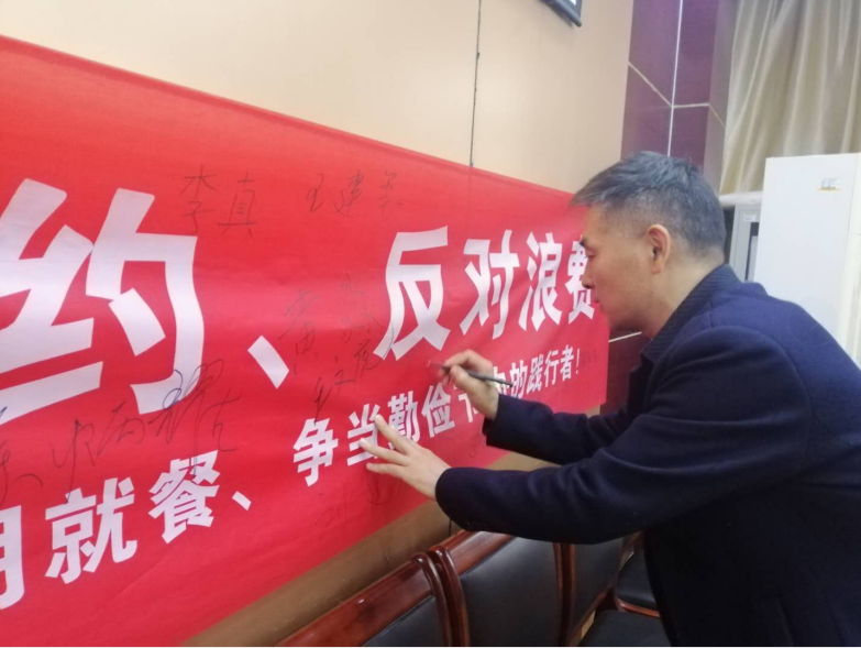 学习之后,组织教工党支部党员在科技楼214进行签名承诺,全体党员排队依次在“厉行节约,反对浪费”横幅上郑重的签上姓名,做出承诺,要节约用餐、文明就餐、争当勤俭节约的践行者!