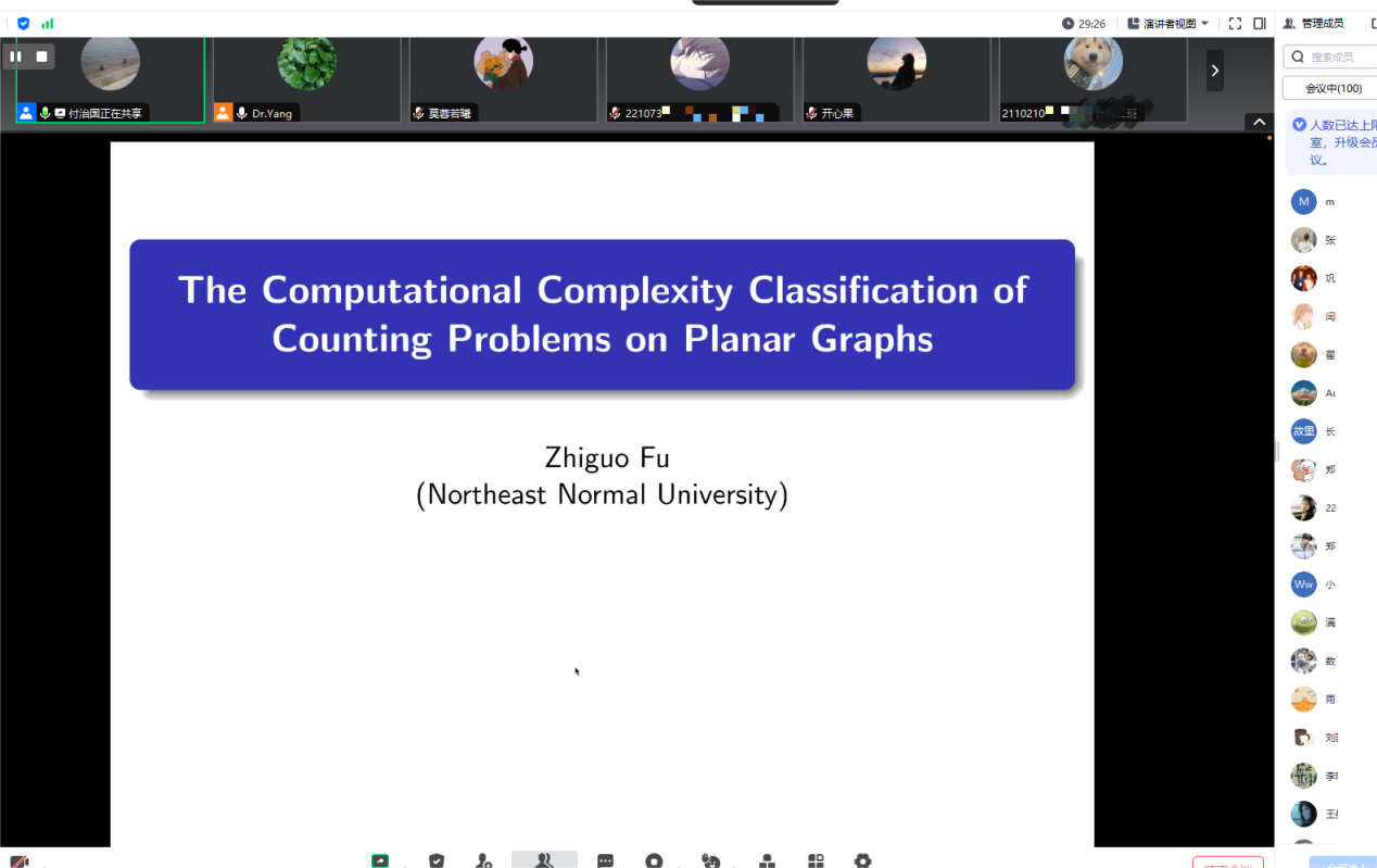 10月19日下午,应365英国上市公司邀请,东北师范大学博士生导师付治国教授应邀为公司计算机应用技术重点学科在线上作了一场题为“平面图上计数问题的计算复杂性分类”的学术报告。365英国上市公司及相关院系师生共100余人参加了此次报告会。
