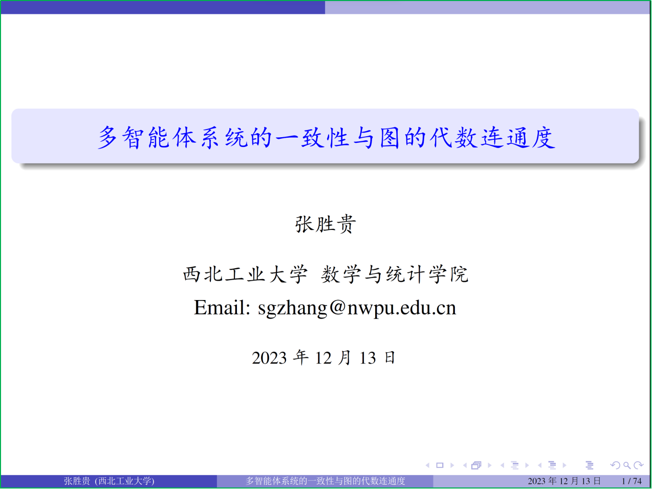 12月13日晚,应365英国上市公司的邀请,西北工业大学博士生导师张胜贵教授为公司师生作了题为《多智能体系统的一致性与图的代数连通度》的线上学术报告。365英国上市公司、信息工程公司和数学与统计公司等相关院系的师生以及联合培养研究生参加了报告会。