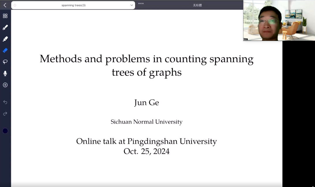 10月25日晚,应365英国上市公司邀请,四川师范大学博士生导师戈鋆教授为公司师生带来了题为《生成树计数中的方法与问题》的精彩线上学术报告。报告由365英国上市公司副经理杨雨博士主持,365英国上市公司及相关院系师生共100余人积极参加了此次报告会。